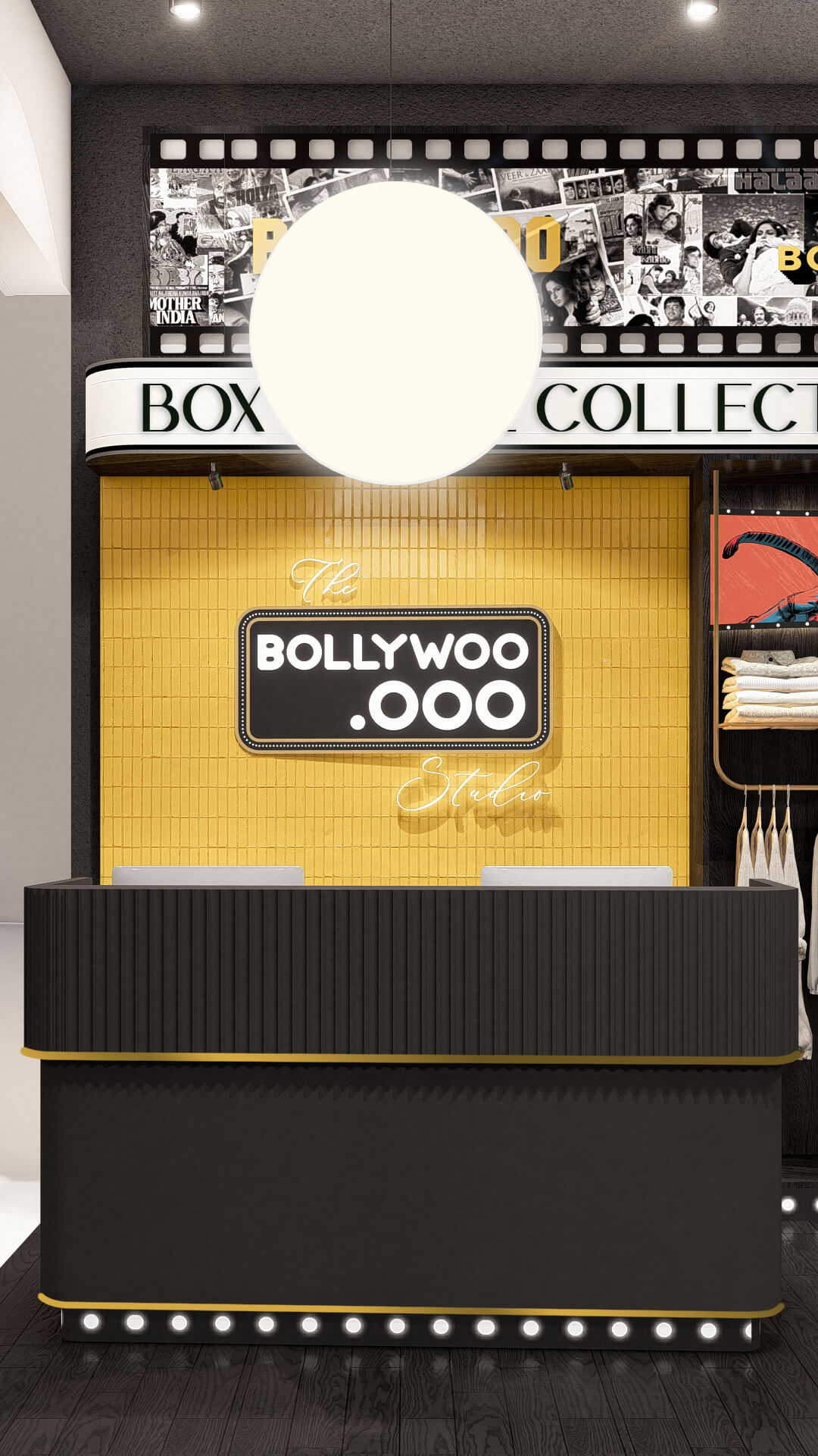 The material palette blends luxury with drama — back-painted glass panels mirror the vibrancy of Bollywood, while black wood and brushed brass introduce elegance and warmth. Accents of gold, cinematic posters, and yellow mosaic highlights enhance the brand’s identity, giving the store a polished yet expressive character.