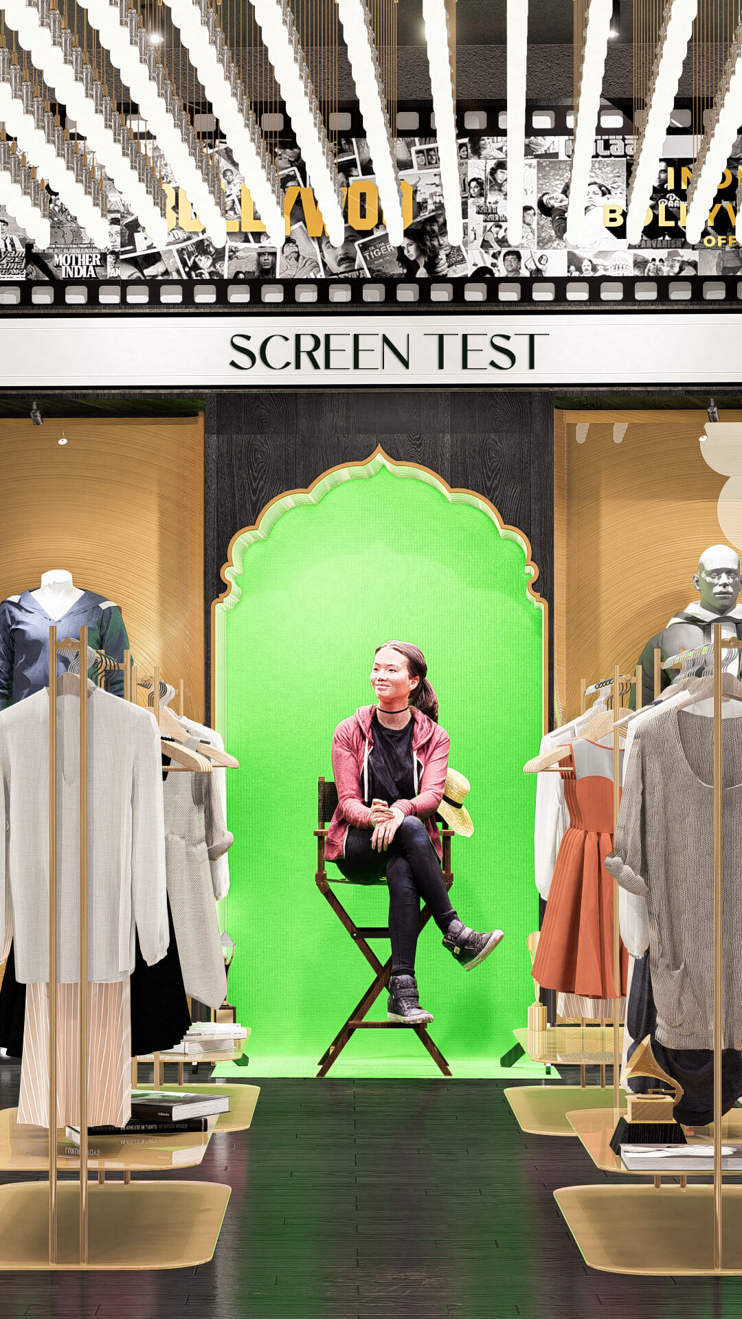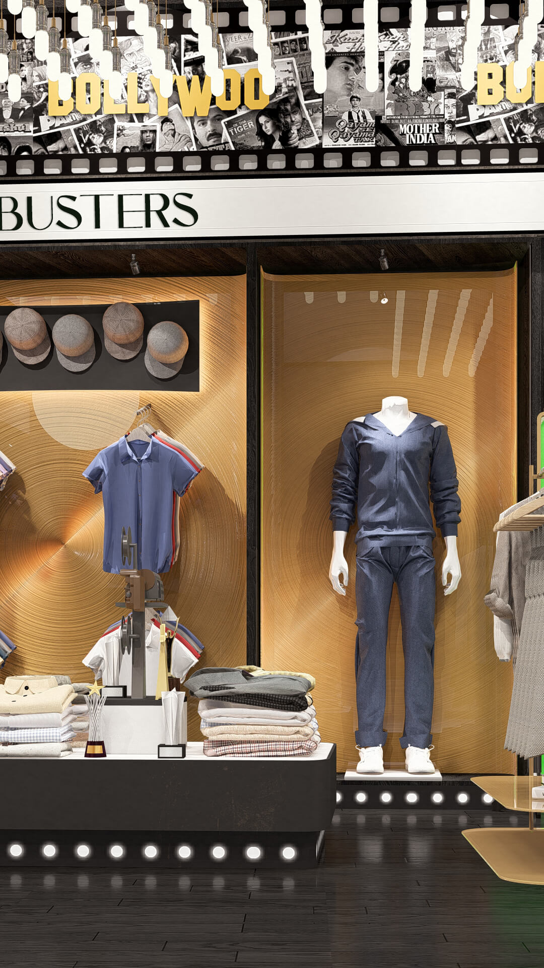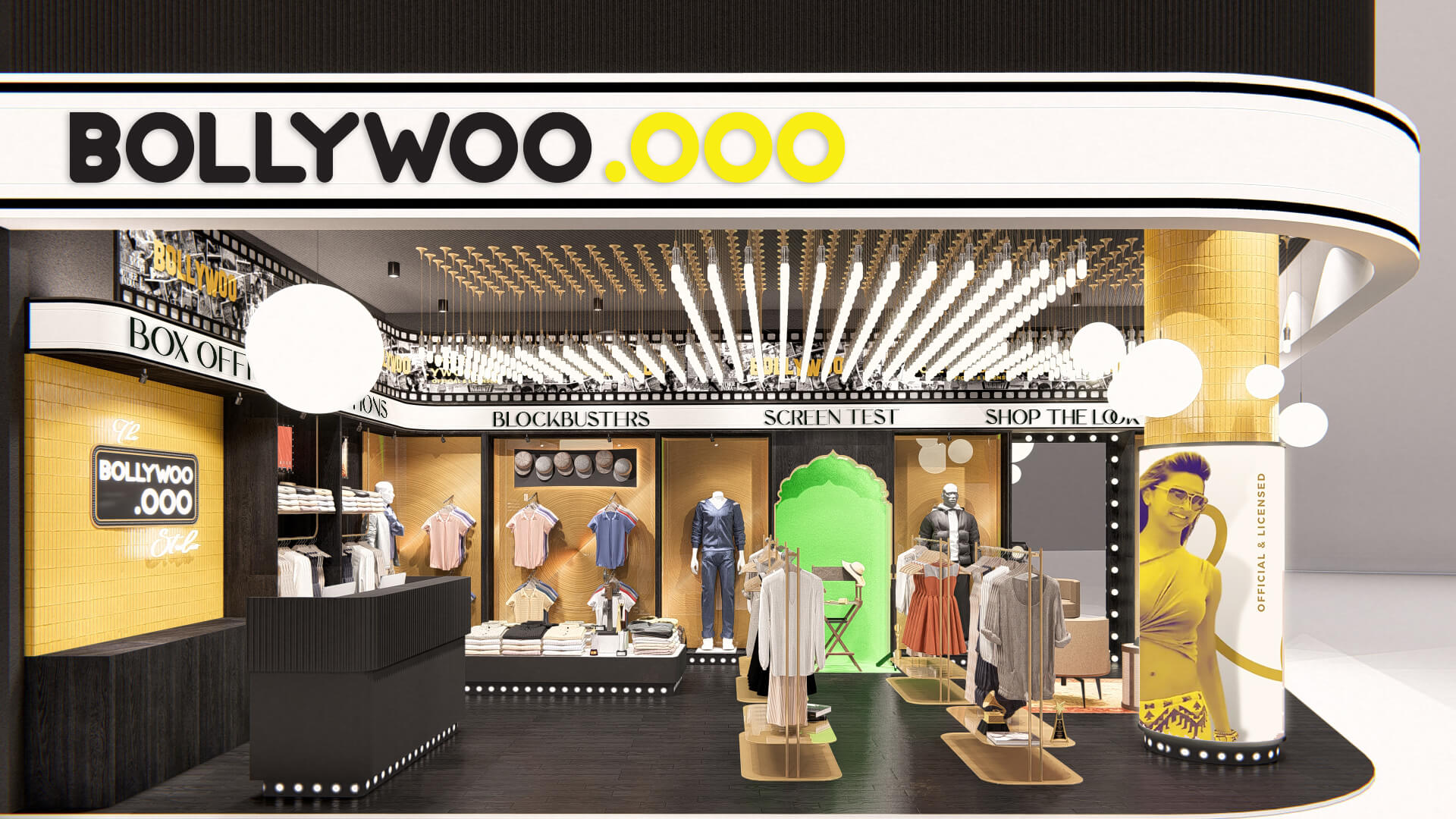 The layout is divided into four intuitive quadrants, encouraging exploration through two clear circulation paths. The central island displays, inspired by on-set costume racks, invite hands-on engagement with apparel collections. Around them, film cameras, movie posters, and symbolic award trophies celebrate the world of cinema, while a continuous LED screen plays dynamic branding visuals that immerse visitors in the Bollywoo story.