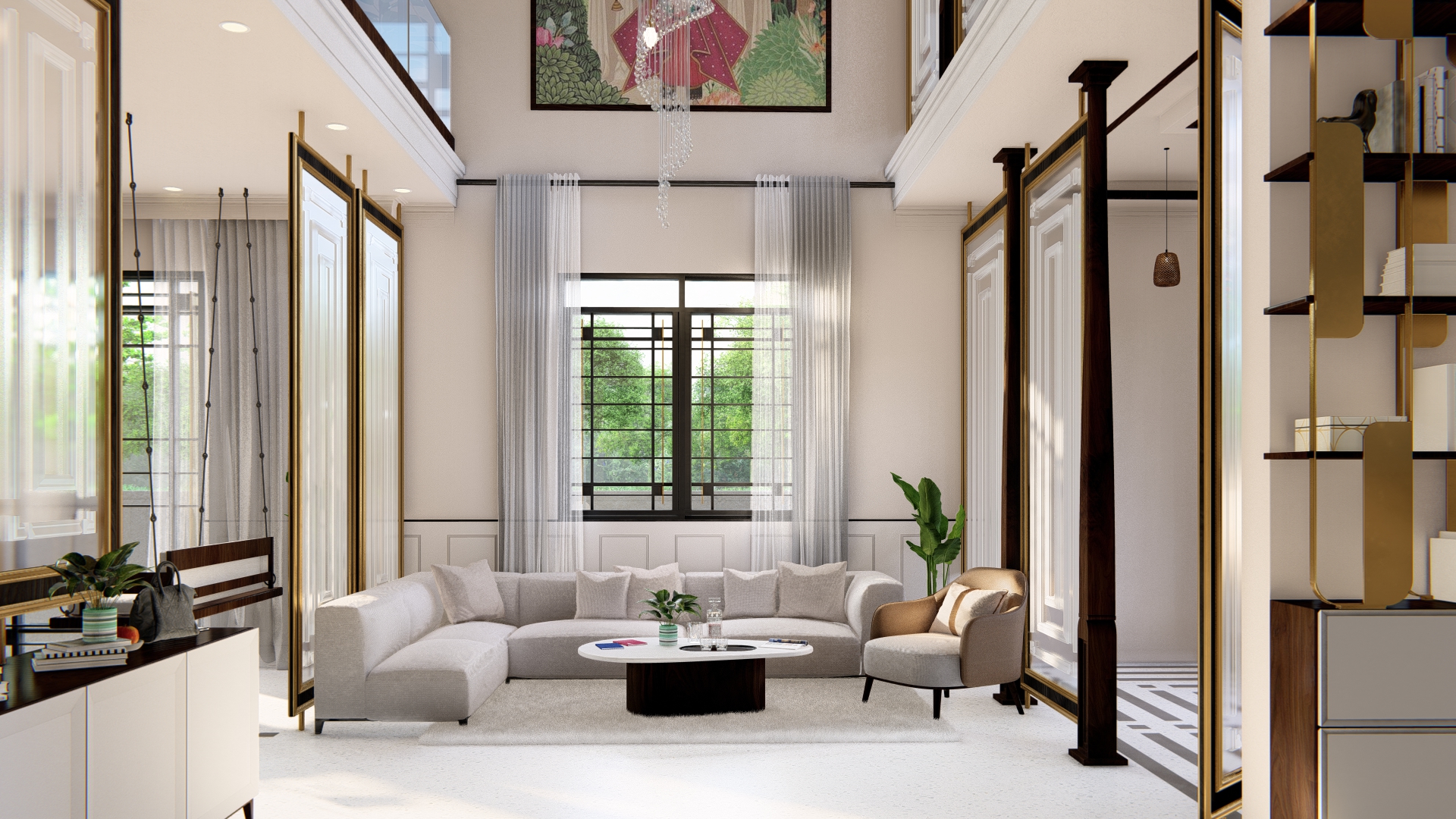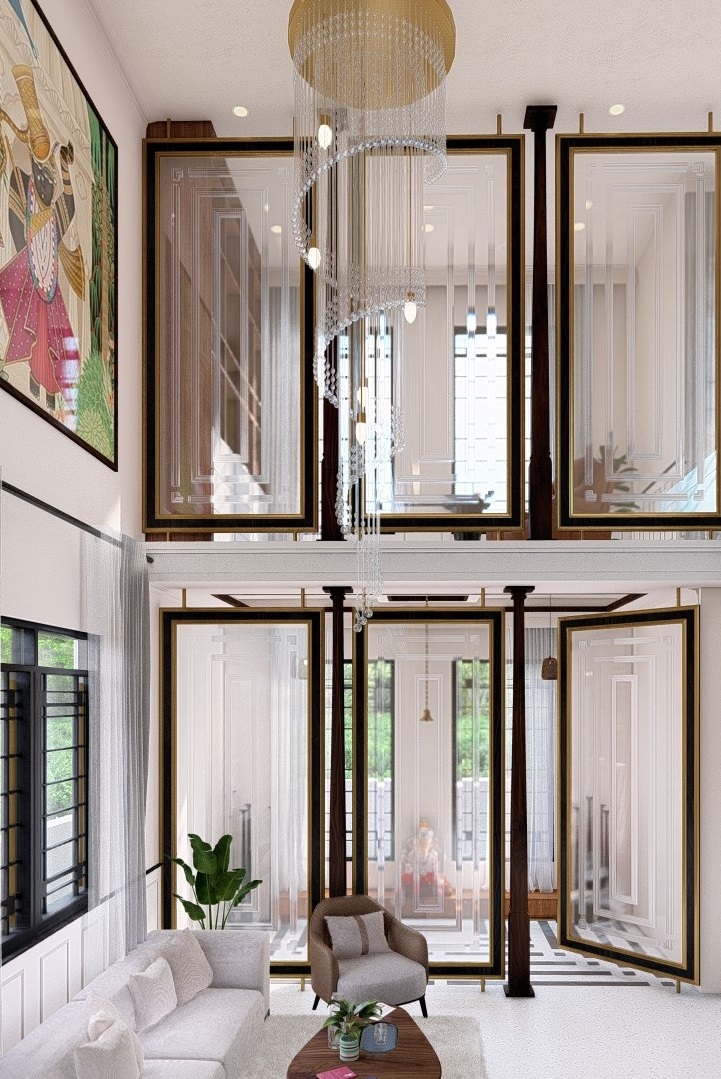 The interiors carry forward the exterior’s neo-classical aesthetic through a palette of whites, soft neutrals, and warm accents. Planned with a focus on volume and proportion, the spaces combine openness with intimacy, offering both grand entertaining areas and quiet personal retreats.
