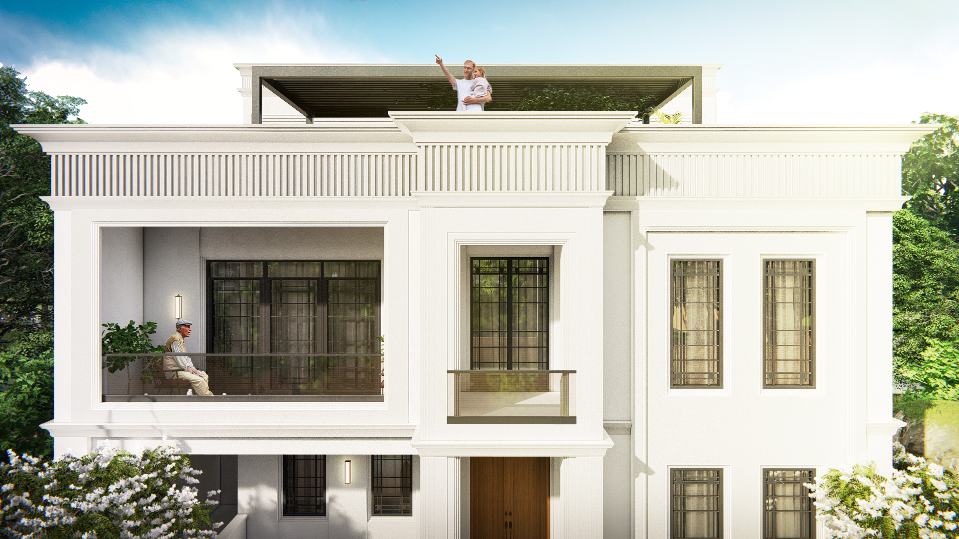 The design takes inspiration from classical symmetry and refined detailing, expressed through a bold, all-white façade. Defined cornices, linear grooves, and recessed balconies create depth while maintaining a sense of restraint.